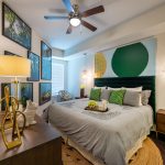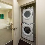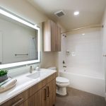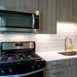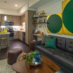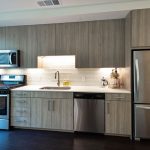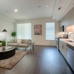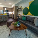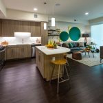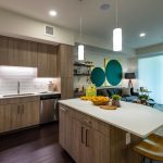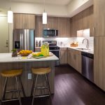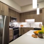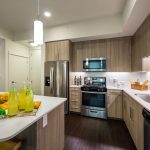 Studio, 1 and 2 bedroom residences – Gas cooktops – Island kitchen with breakfast bar* – Quartz kitchen countertops with glass tile backsplash –Stainless steel appliances – Single basin kitchen sinks – Wine refrigerator* – Under-cabinet LED lighting – Vinyl plank flooring in living areas and bedrooms -Sonos® Sound System – Nest thermostats – Quartz bath countertops and backsplash – Walk-in frameless shower* – Undermount bath sinks – LED-backlit mirrors – Bluetooth enabled connectivity – Front-loading washers & dryers* – USB charging ports – Solar shades* – Walk-in closets* – Private balconies* – Energy-efficient lighting